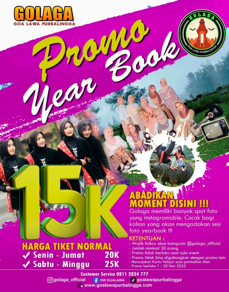 Nah, di Bulan November 2025, Goa Lawa Purbalingga (GOLAGA) menghadirkan Promo Spesial Yearbook untuk sekolah-sekolah yang ingin membuat kenangan akhir tahun dengan konsep foto yang berbeda dari biasanya!